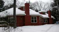 livingroom with woodburning fireplace, TV/VCR, kitchen, screened sunroom